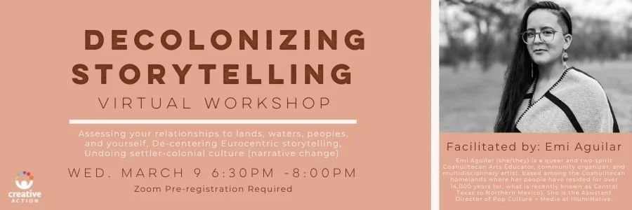 In this collaborative workshop, participants will engage in reflection, dialogue, and storytelling to decolonize your practice. This workshop is intended for arts educators, artists, storytellers, caregivers, youth workers, and adult educators. This workshop will de-center settler-colonial perspectives, teaching practices, and values. More info HERE